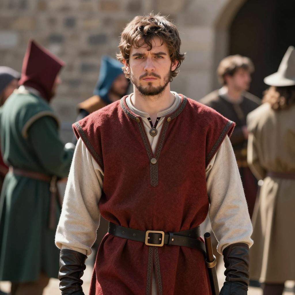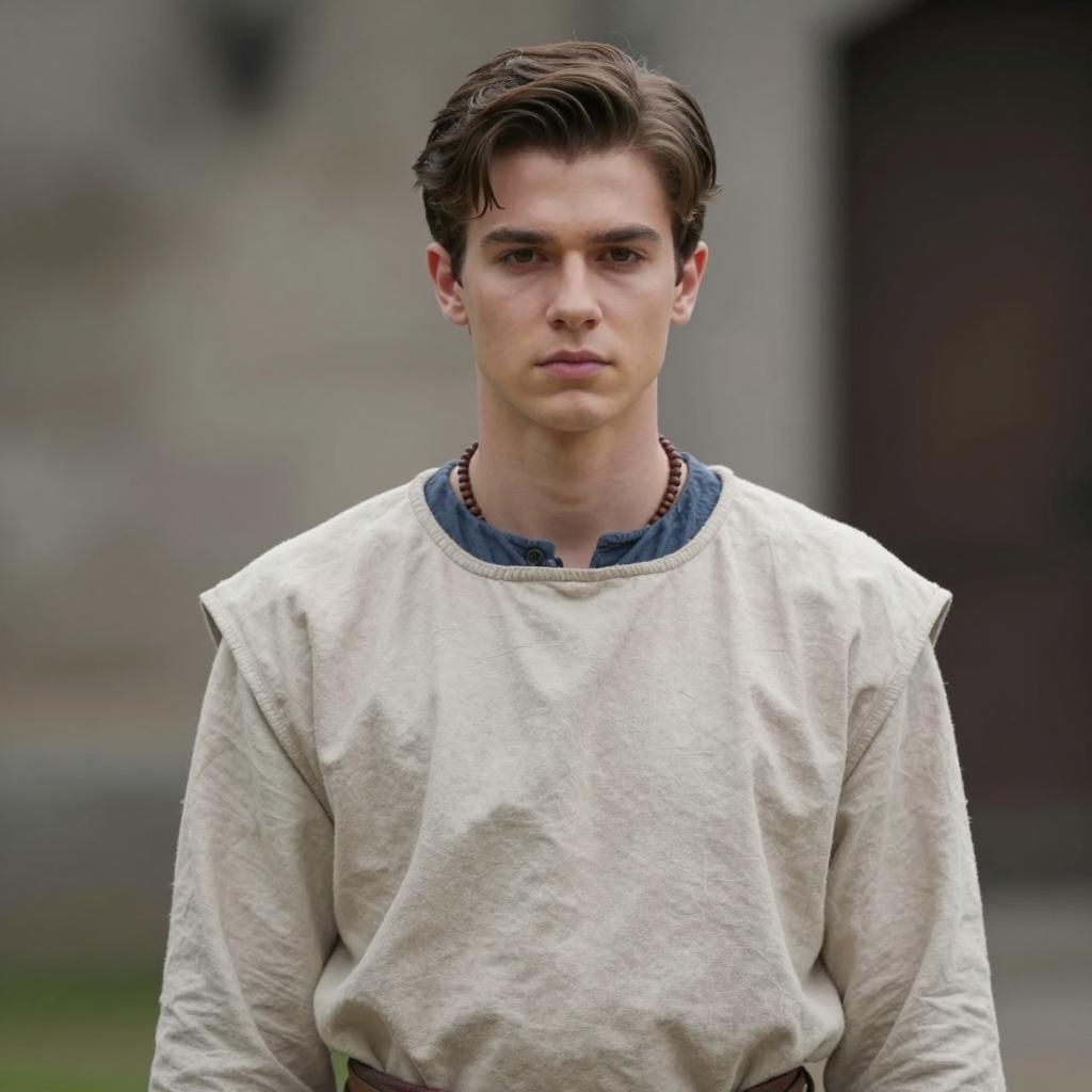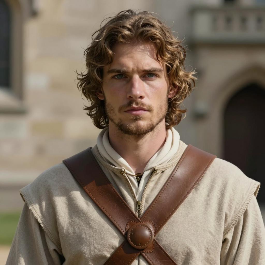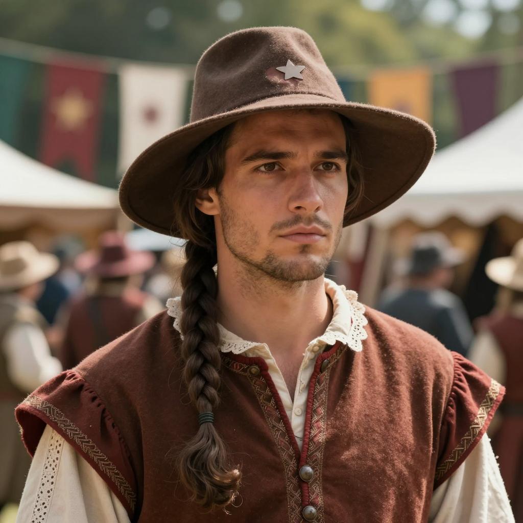 Middle ages costume male, photo-realistic, close-up portrait of a handsome young man with light skin, blue eyes, and a trimmed beard, wearing a brown turban with a feather, brown scarf, beige button-up shirt, and black suspenders, outdoor setting with blurred background, natural light, serious expression, historical clothing style, realistic ures and shadows, slight smirk, medium shot, focused on face, slight background blur, cinematic style
