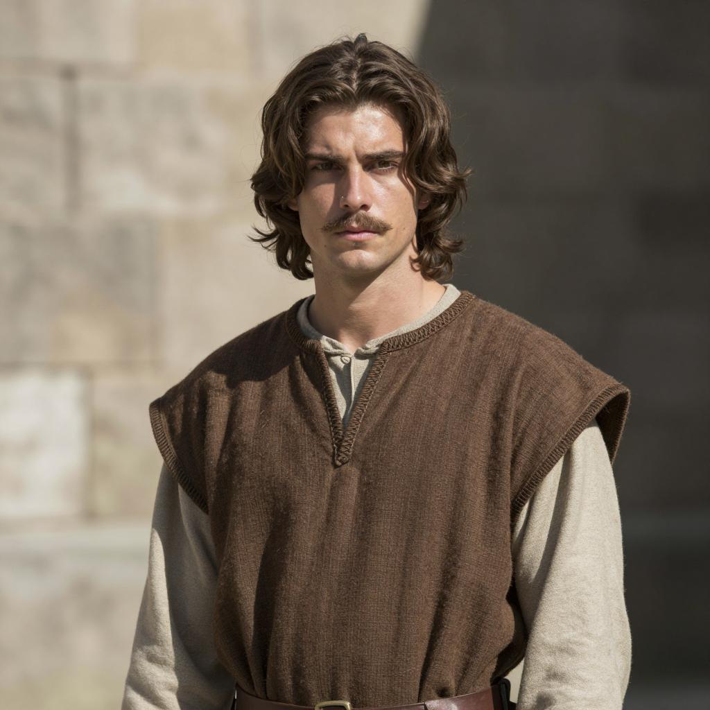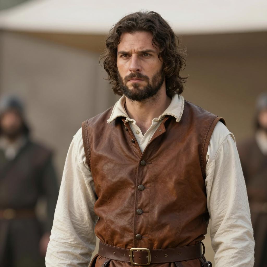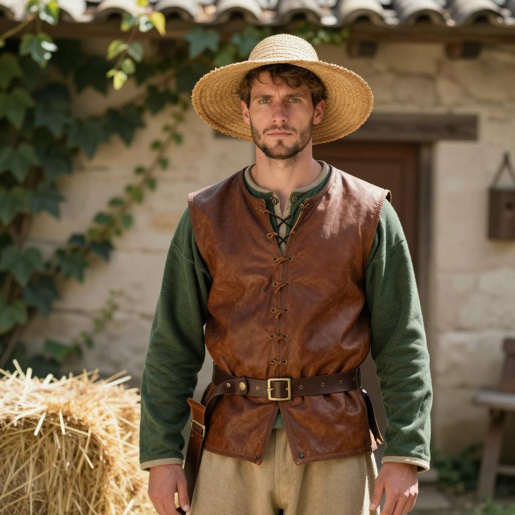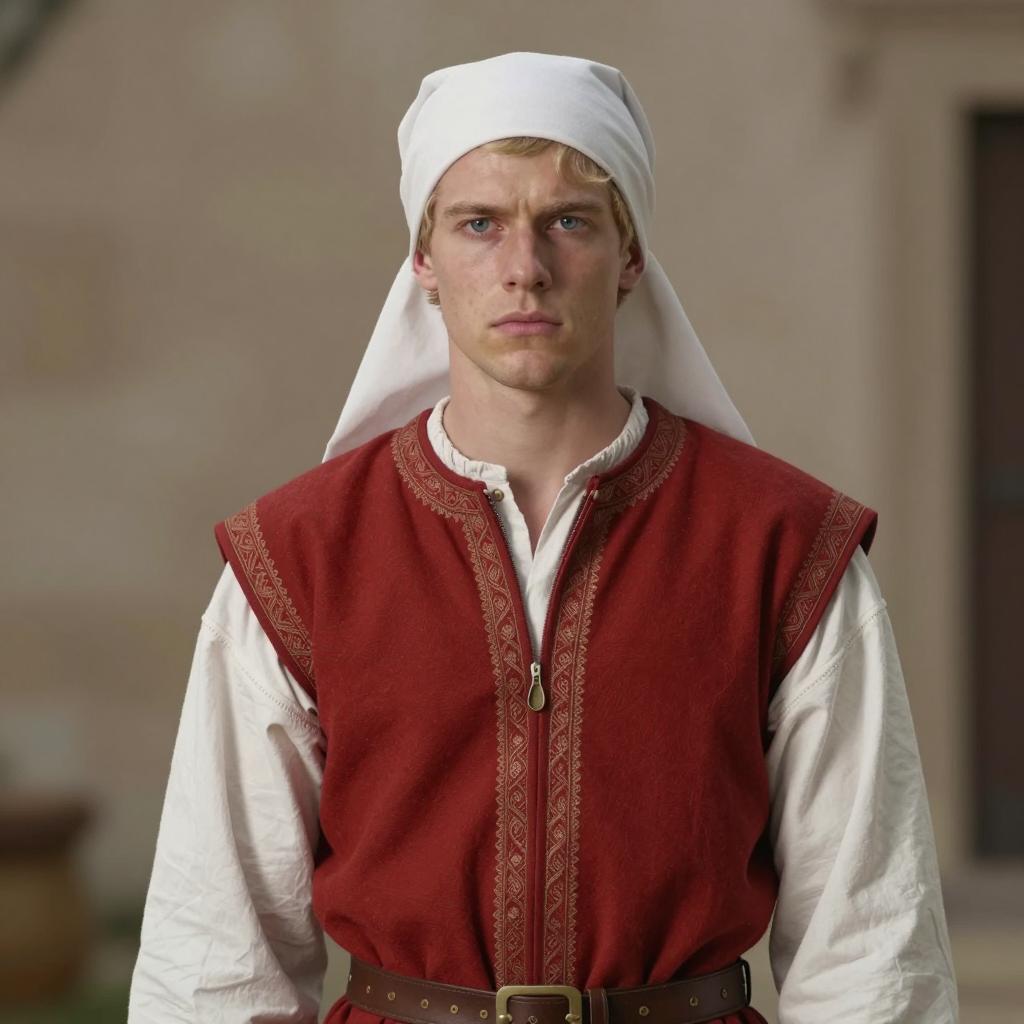 Middle ages costume male, photo-realistic, close-up portrait of a handsome young man with light skin, blue eyes, and a trimmed beard, wearing a brown turban with a feather, brown scarf, beige button-up shirt, and black suspenders, outdoor setting with blurred background, natural light, serious expression, historical clothing style, realistic ures and shadows, slight smirk, medium shot, focused on face, slight background blur, cinematic style