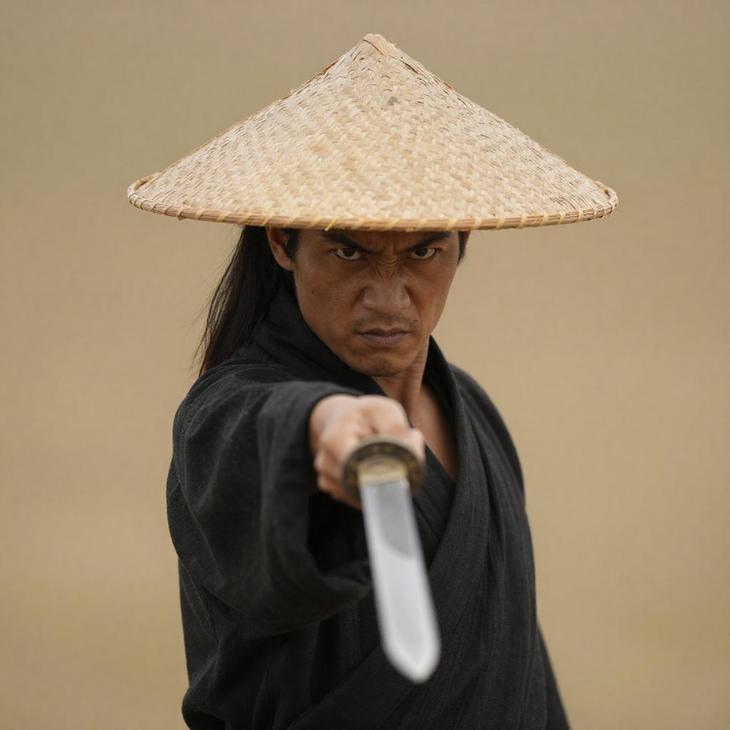 Digital artwork of an Asian male martial artist in a dark, traditional kimono, extending his right arm forward with a sword. His expression is focused, with dark hair tied back. The background is a blurred, green forest. The artist's "Moviesulf8B.com" is in the bottom right corner.