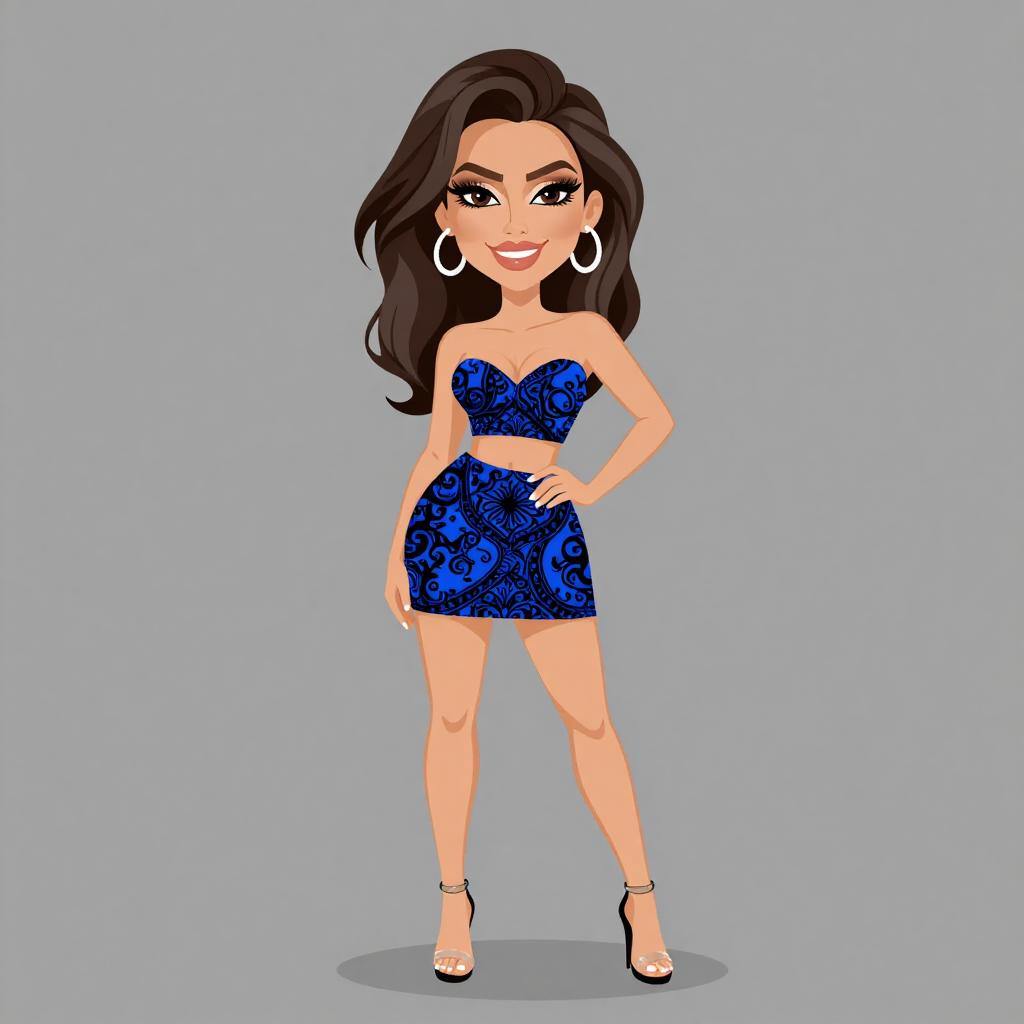 Woman with pretty face and pretty hair. smiling Woman, contemporary glam, ruched mini dress in aqua blue, sweetheart neckline, long sheer polka-dot balloon sleeves, fitted silhouette, thigh-length, tan structured handbag, large hoop earrings, white strappy high heels, white studio background. --sref 1467