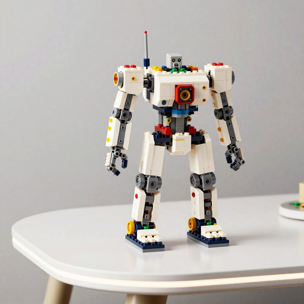 AI Lego set featuring futuristic robotic designs, vibrant colorful bricks, intricate mechanical joints, displayed on a sleek white table with subtle glowing accents, photorealistic style, high detail, soft studio lighting