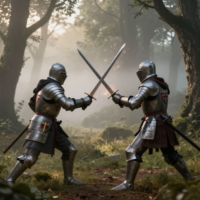 Showdown between two medieval knights in a misty forest clearing at dawn, swords clashing with sparks, detailed armor with heraldic symbols, ancient trees surrounding them, soft sunlight filtering through the fog, epic fantasy battle scene, realistic and immersive.