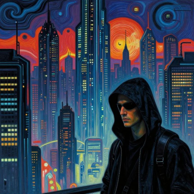 Claude Monet a person walking out through a time portal diamond-shaped door. future night city with neon lights photo,