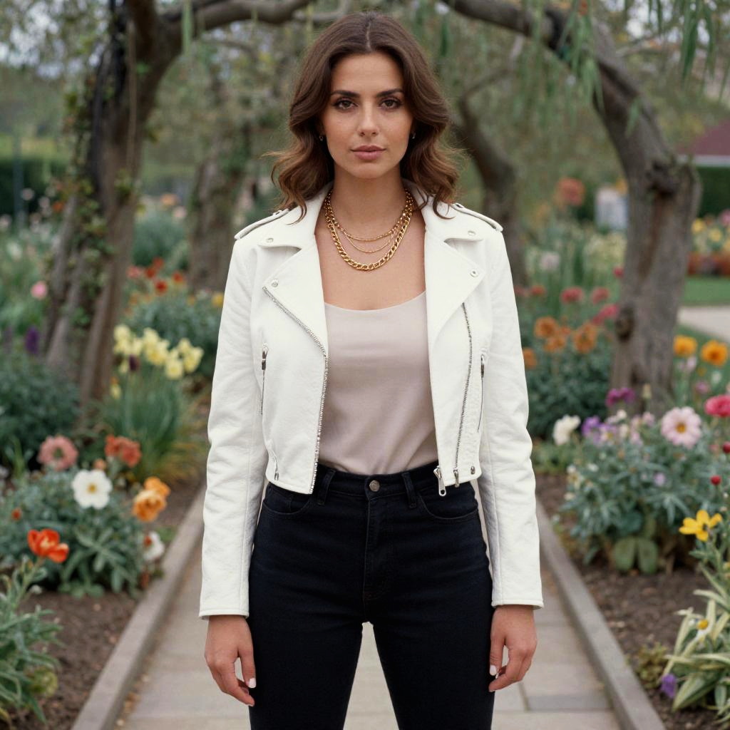 A willowy woman in a stylish white moto jacket with an asymmetrical zip, light beige top, and high-rise black skinny jeans, adorned with gold layered necklaces and loose waves, stands gracefully in a flower garden with a stone pathway, captured in a vibrant kodachrome analog film style. Sexy. Pretty face and beаutiful eyes. Big breasts