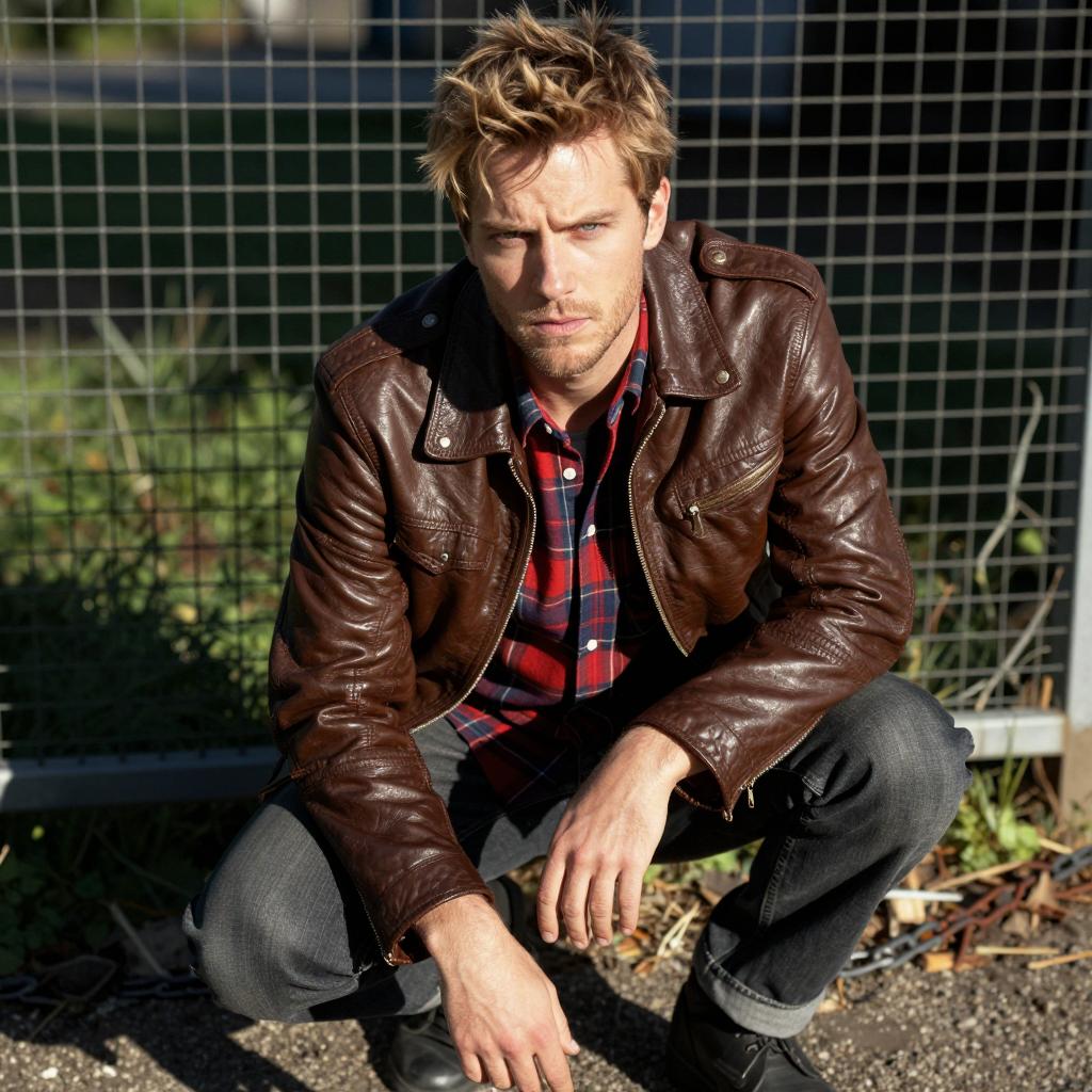 Photograph of two men on a subway train. The man in the foreground has spiked brown hair, wears a red leather jacket over a colorful graphic T-shirt with red sunglasses hanging from the shirt, and gestures with his right arm raised. The man in the background is partially visible, wearing a dark jacket. Blue and white subway signs are in the background. The man in the foreground has a focused expression, while the other man's face is not visible.