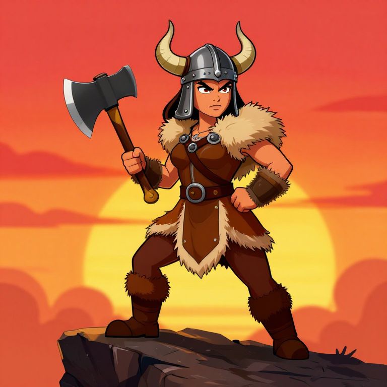 Female viking cartoon character standing proudly on a rocky cliff, wearing traditional fur clothing and horned helmet, holding a battle axe with a fierce expression, set against a dramatic sunset sky, vibrant colors, bold outlines, dynamic pose