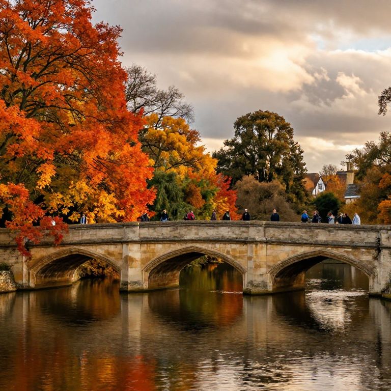 Cambridge bridge over river Cam during autumn, trees with fiery orange and red leaves reflecting on calm water, medieval stone bridge with tourists and local people strolling, cloudy sky with warm rays of sunlight, richly textured environment.