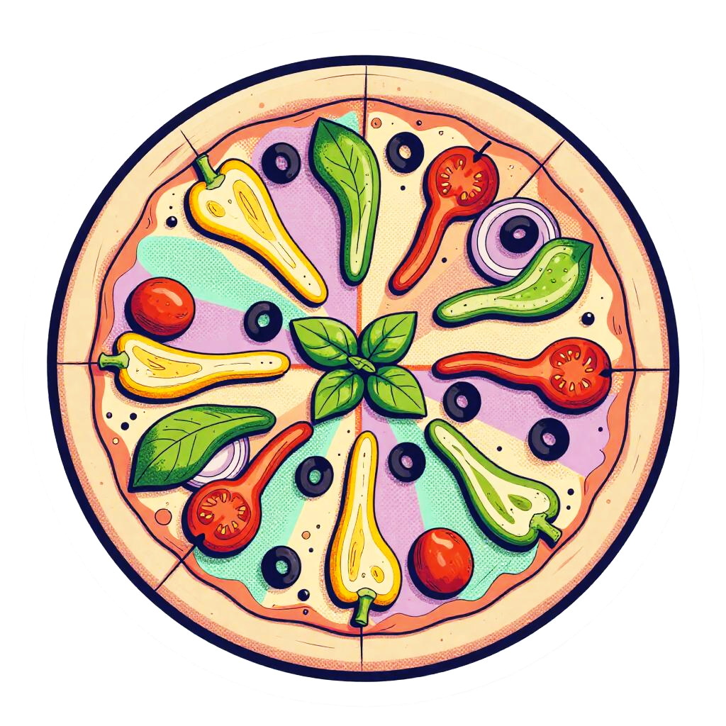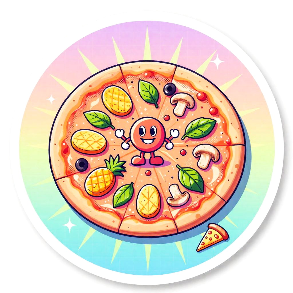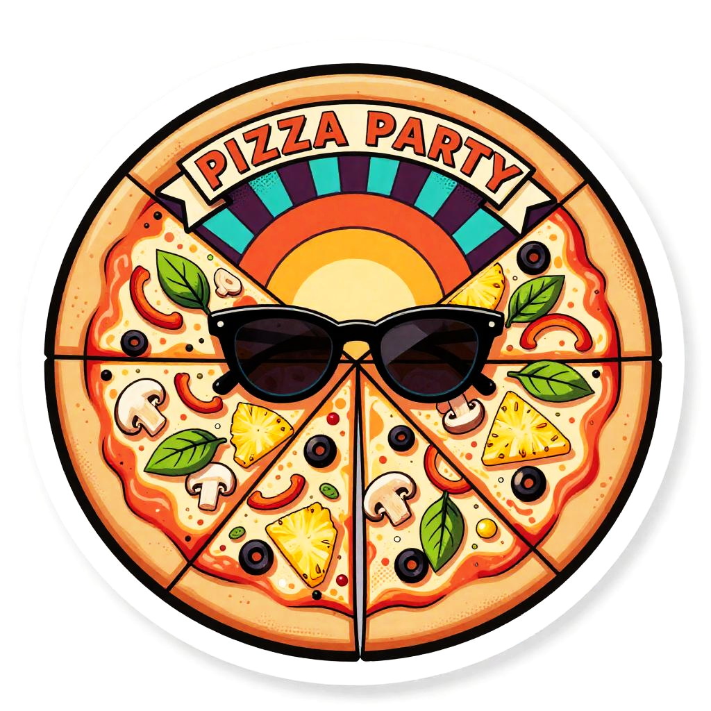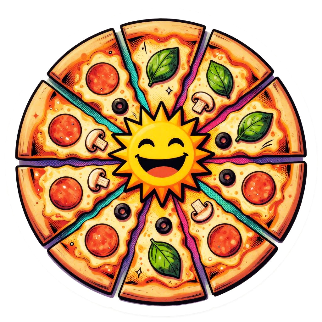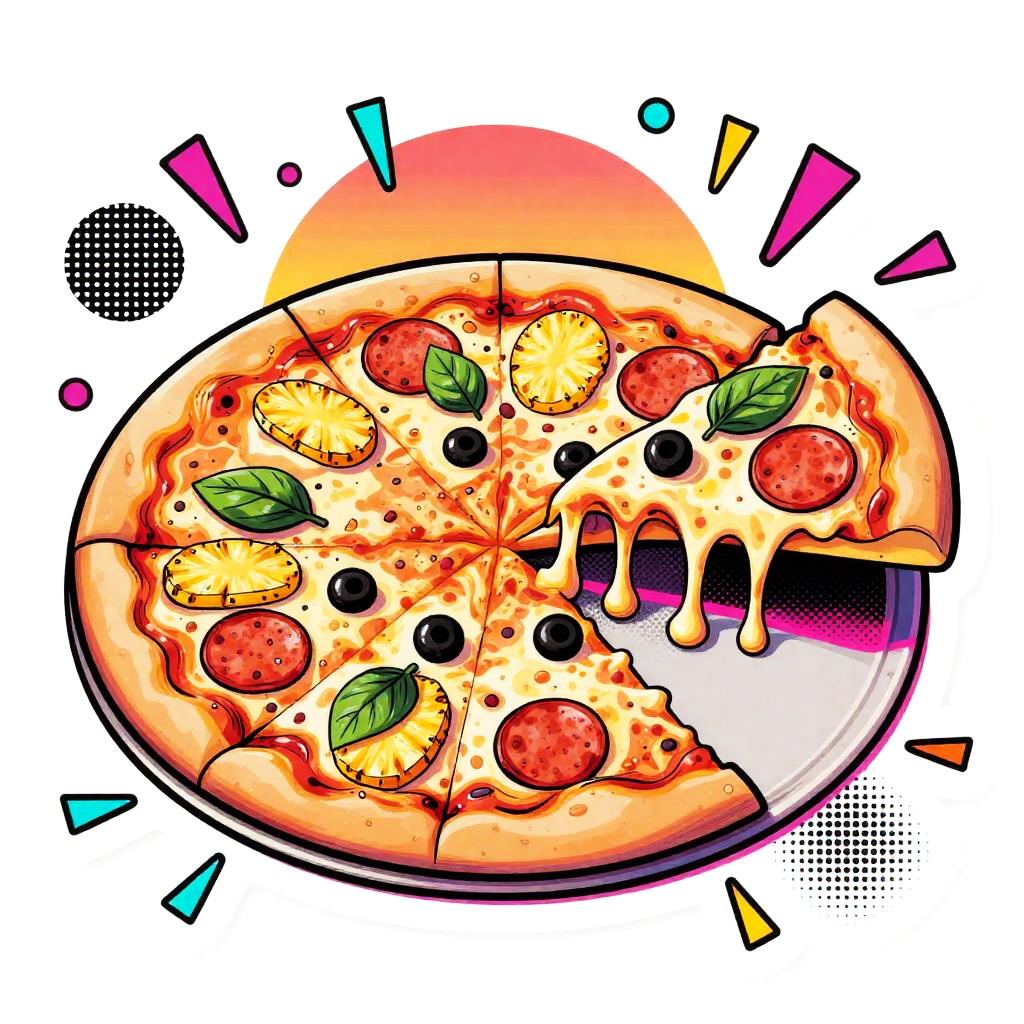 Whole pizza pie (top-down view, cut into 8 slices) with mixed toppings: pepperoni, mushrooms, basil leaves, black olives and gooey cheese, pop art with 1980s Memphis-inspired graphic elements, vibrant pastel-neon mix (coral, mint, butter yellow, lavender, electric teal accents), pastel-neon retro (80s Memphis), bold black contour lines with a secondary neon rim (hot pink) for pop, thick comic-style linework + halftone dot shading and halftone sunburst highlights, retro 1980s pop-Memphis aesthetic (geometric shapes, playful patterns, confetti accents), isolated on white background — die-cut sticker with 3mm white border and subtle long drop shadow, semi-gloss sticker look with soft specular highlights, centered whole pie, one slice slightly pulled out with exaggerated cheese pull, scattered geometric confetti around, playful, upbeat, nostalgic-futuristic