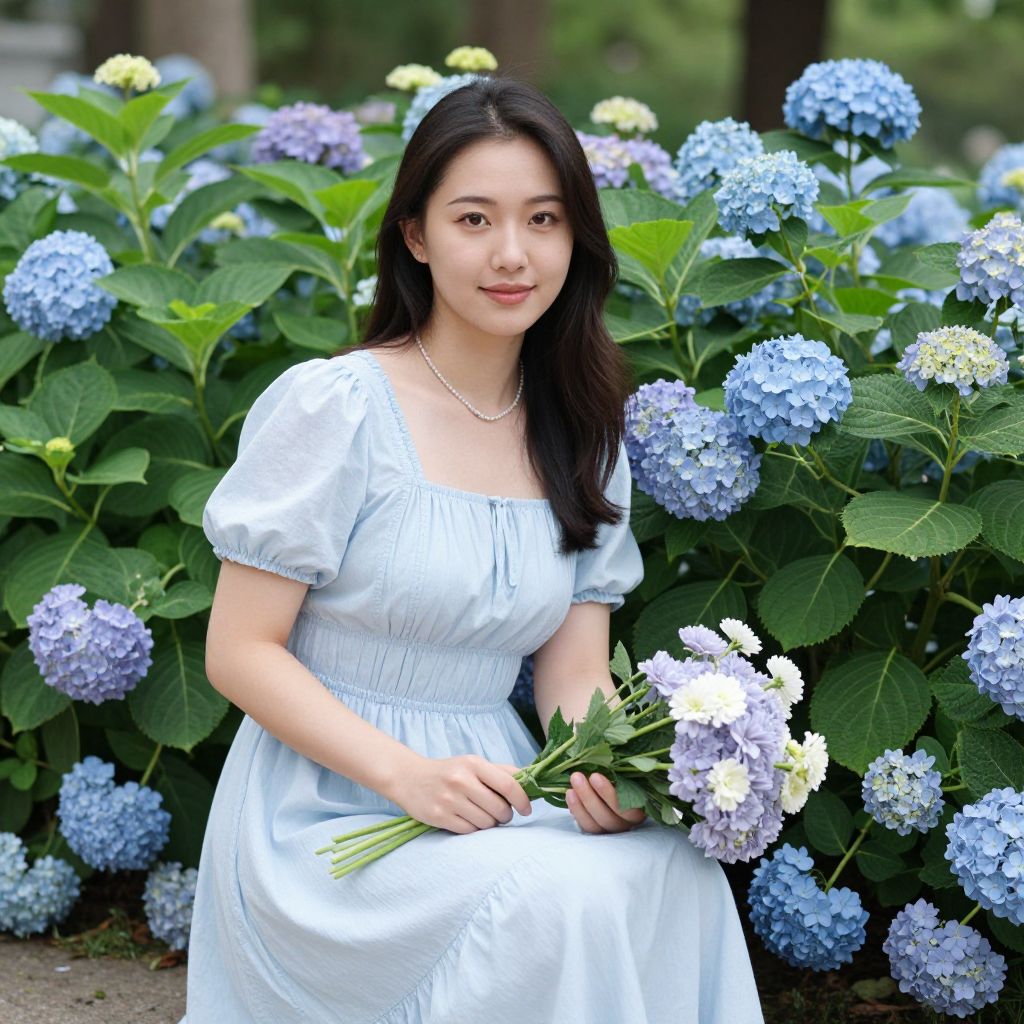 Photograph of an Asian woman with long black hair and fair skin, wearing a white, short-sleeved, square-neck dress. She is sitting amidst lush greenery with large blue and purple hydrangea flowers. She holds a small bouquet of white and lavender flowers in her hands. The background is blurred, highlighting the vibrant flowers. Her expression is soft and serene. The image has a natural, outdoor setting with a focus on the woman and the floral surroundings. The lighting is soft, adding a gentle, peaceful atmosphere to the photograph.
