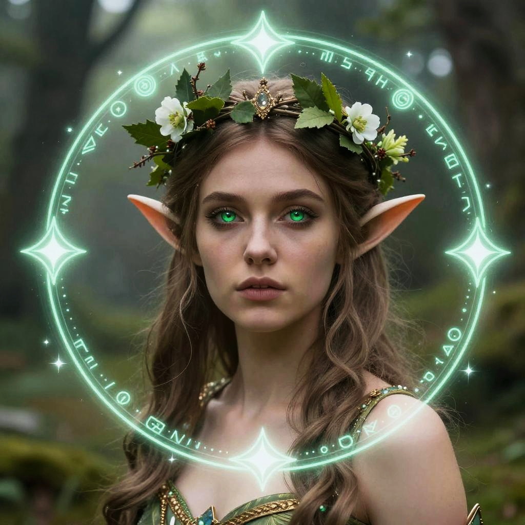 Female elf noble wearing a crown of leaves and flowers, surrounded by glowing magical runes, delicate features with emerald green eyes, standing in a misty woodland glade