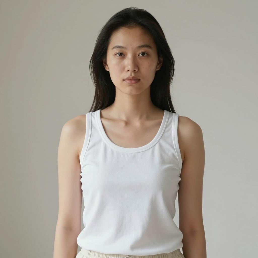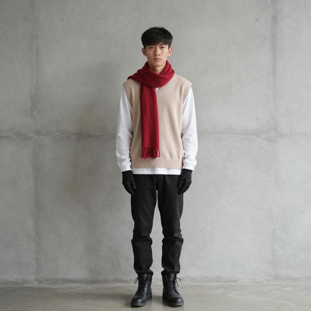 Minimal clothing costume, photograph of young Asian man, standing against a rough stone wall, wearing light grey loose-fitting pajama set, long sleeves, V-neck, pants with cuffs rolled up, black and brown sandals, short black hair, neutral expression, natural light, daytime, outdoor setting, slightly ured concrete ground, casual fashion, minimalist style, front view, full body