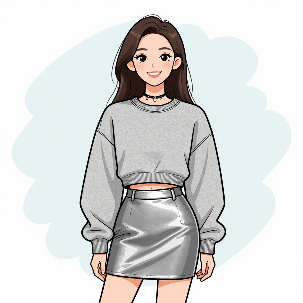 Woman with pretty face and pretty hair. smiling Woman, casual chic, light grey cropped sweatshirt, long sleeves, ribbed cuffs and neckline, metallic silver A-line mini skirt, glossy finish, choker necklace with small pendants, minimal makeup, natural hairstyle, studio background with a light wash. --sref 1467
