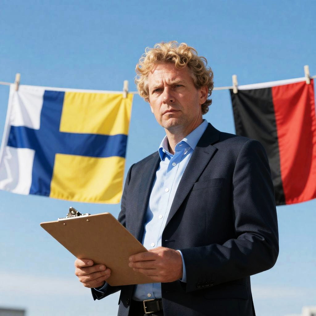 Middle-aged man with curly blonde hair, serious expression, wearing dark suit over blue shirt, standing against clear blue sky. Behind him, clothesline with Finnish flag, yellow flag, and red-black flag. Man holds a clipboard. Bright daylight.