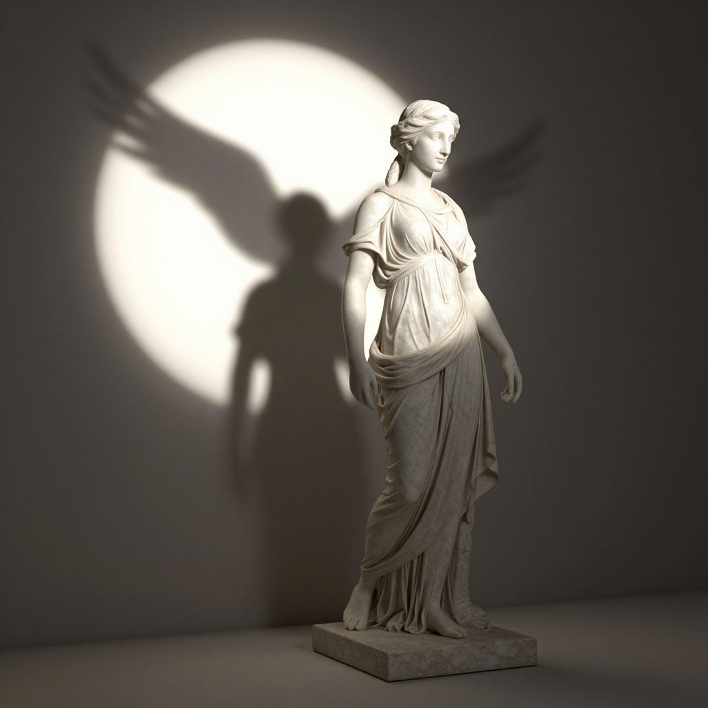 In a dramatically lit 3D-rendered scene, a classical marble statue of a woman stands solemnly as her shadow transforms into a majestic bird silhouette against a radiant circular light source, evoking a surreal and contemplative atmosphere reminiscent of mythological storytelling.
