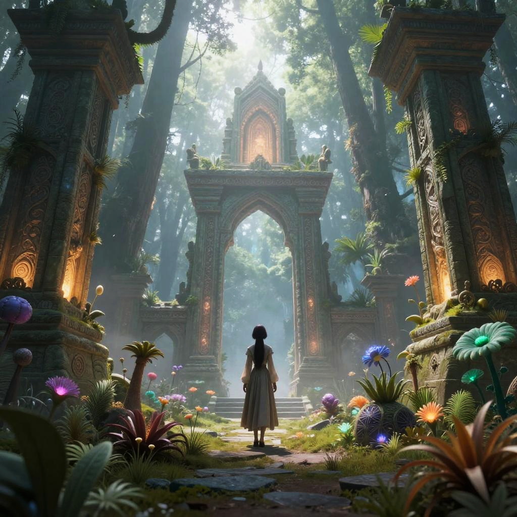 Fantasy forest temple scene: Silhouette of a girl in a long dress stands before ornate, sunlit archway surrounded by glowing mushrooms and lush