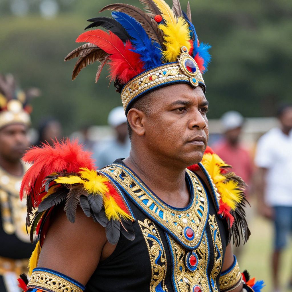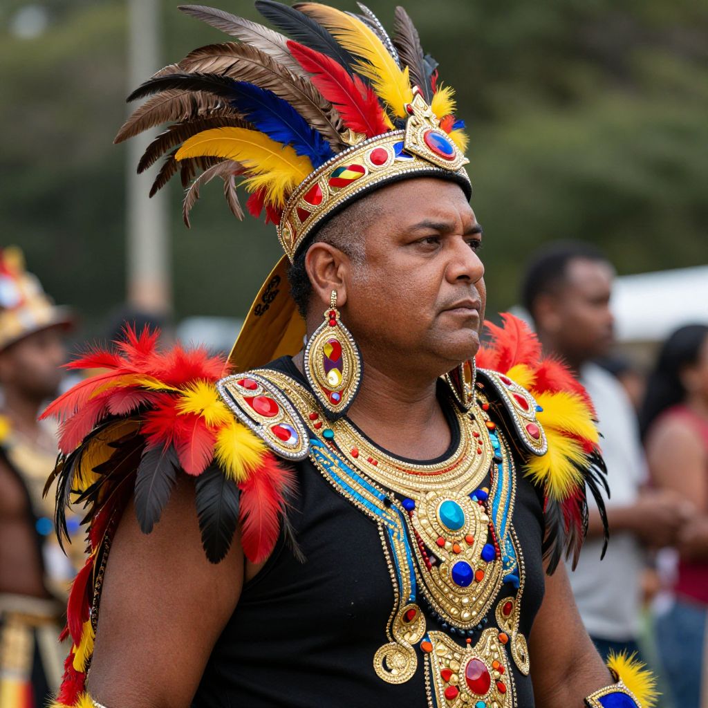 Photograph of a man with medium brown skin and short black hair, wearing an elaborate, colorful feathered crown and matching shoulder adornments. His outfit is black with intricate gold and blue detailing, featuring red and yellow feathers. He has a serious expression and is slightly turned to the side. The blurred background shows an outdoor setting with greenery and other people.