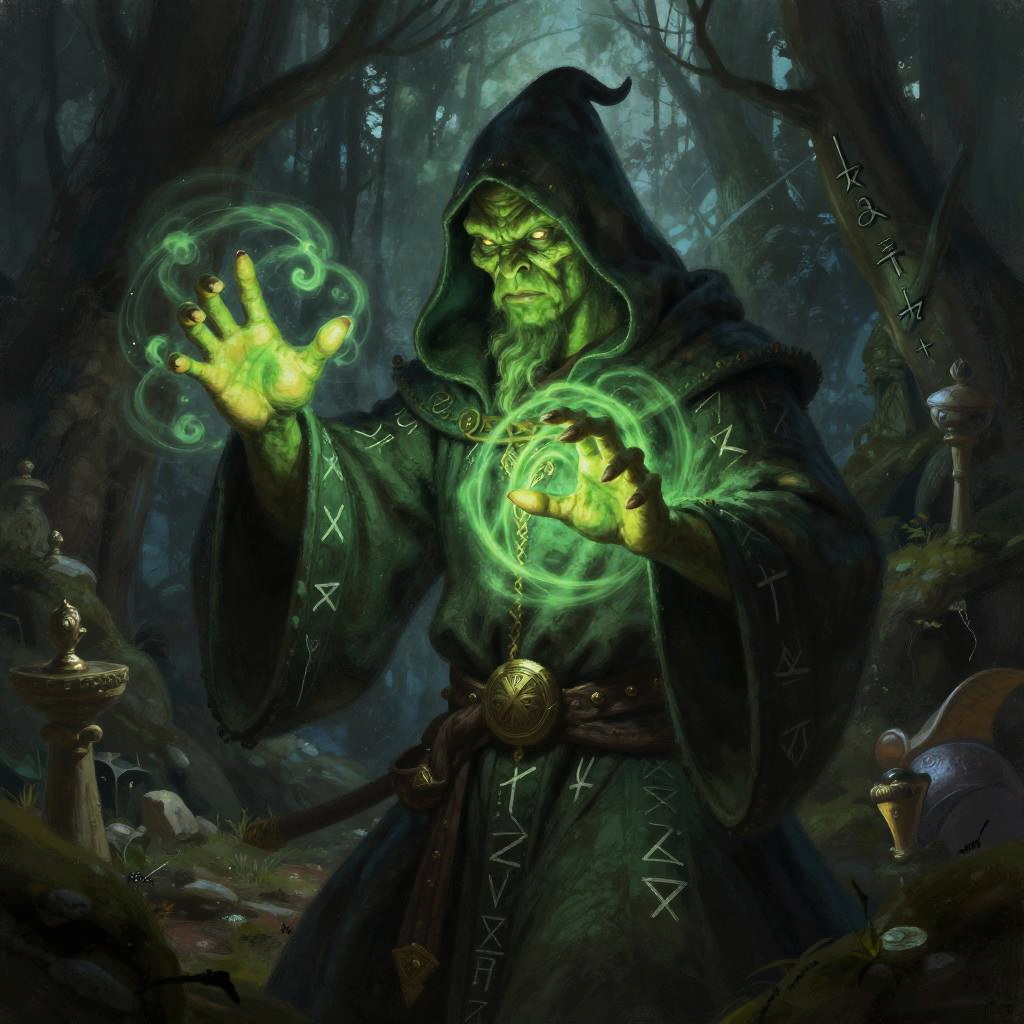 Medieval green goblin mage casting a spell in an enchanted forest, swirling magical energies around hands, wearing a hooded robe adorned with runes, mysterious atmosphere, digital painting
