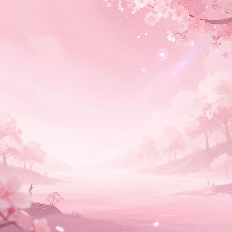 This digital artwork features a soft, pink-hued cherry blossom scene. The upper and right sides are filled with delicate cherry blossom petals and branches, creating a dreamy, ethereal atmosphere. The lower left corner shows a small, silhouetted figure standing near a grassy hill, partially obscured by the blossoms. The background is predominantly white, providing a stark contrast to the pink petals and enhancing the serene, almost otherworldly quality of the image. The overall style is minimalist and whimsical, with a focus on soft textures and gentle colors.