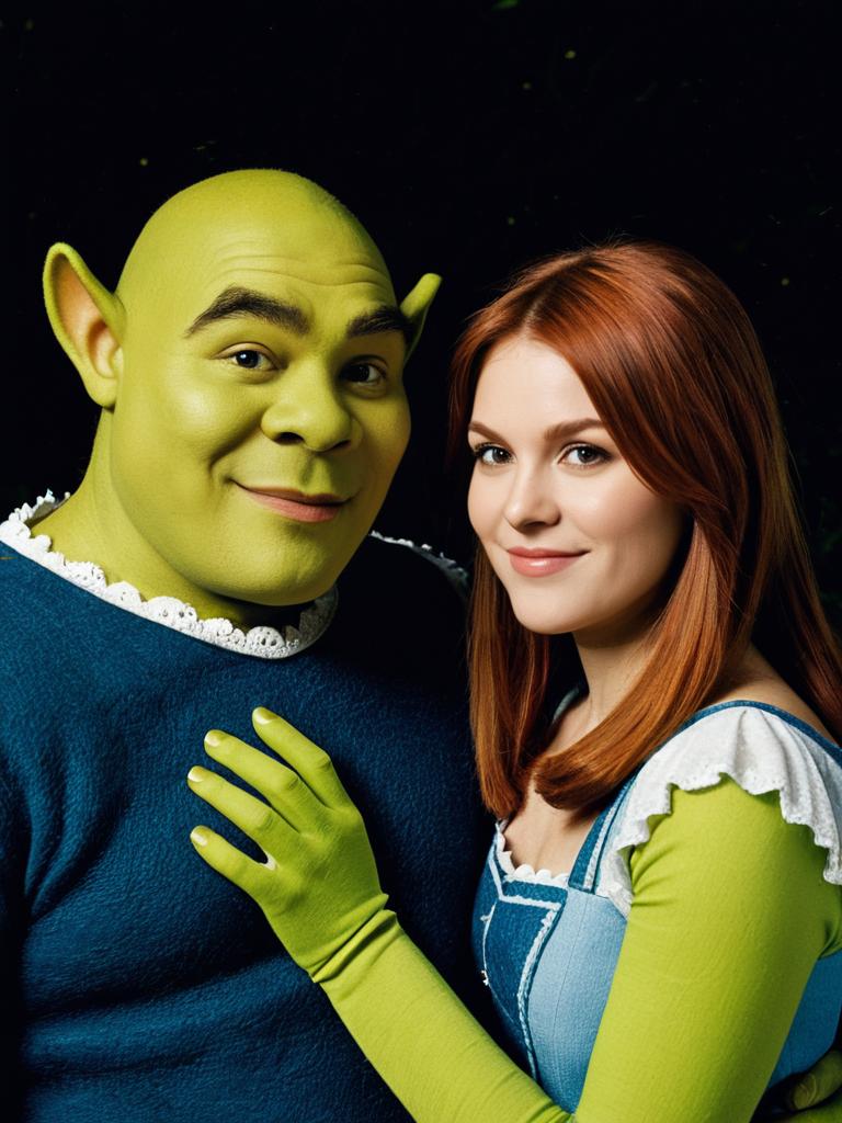 Couple in Shrek and Fiona Costume, cinematic realism, playful fantasy portrait