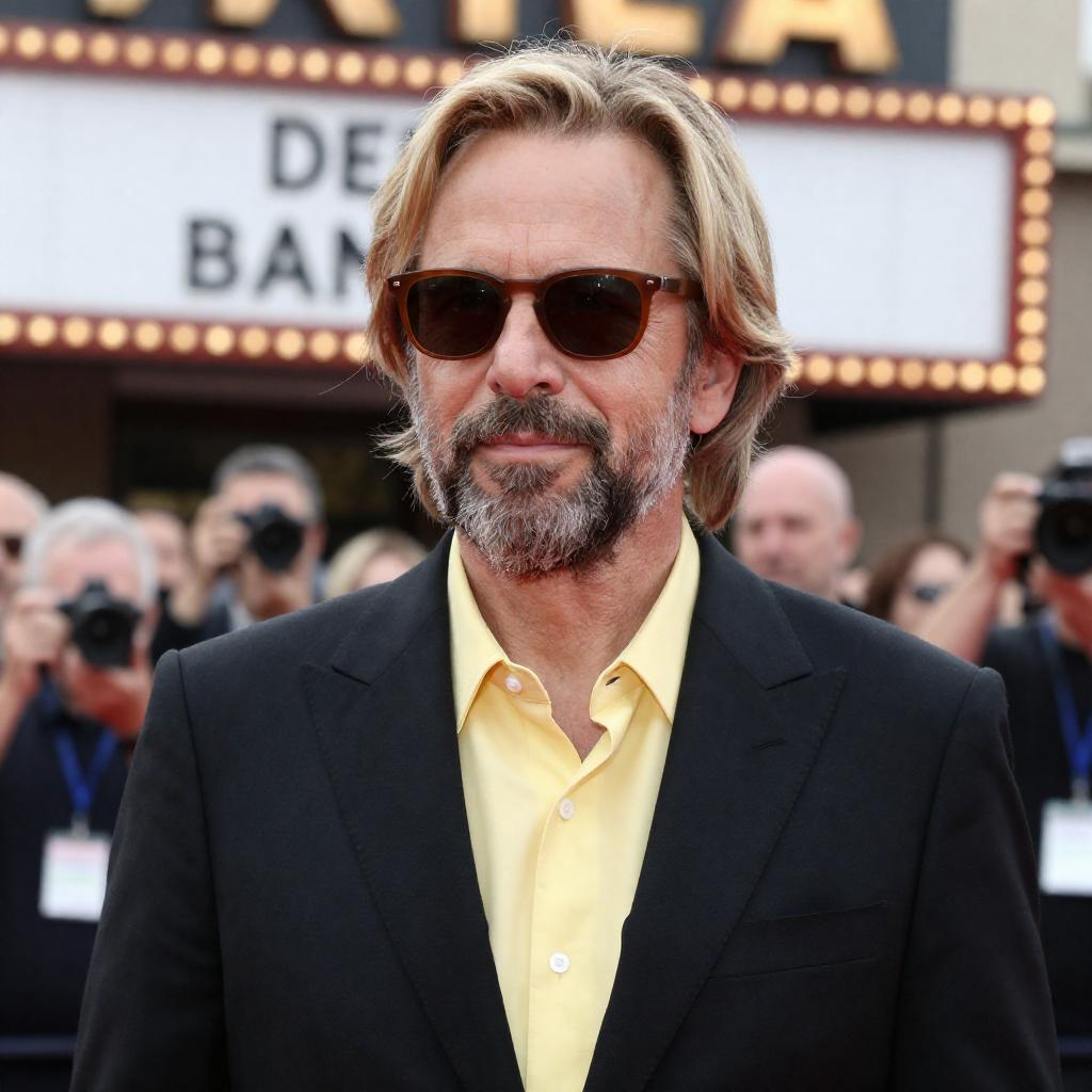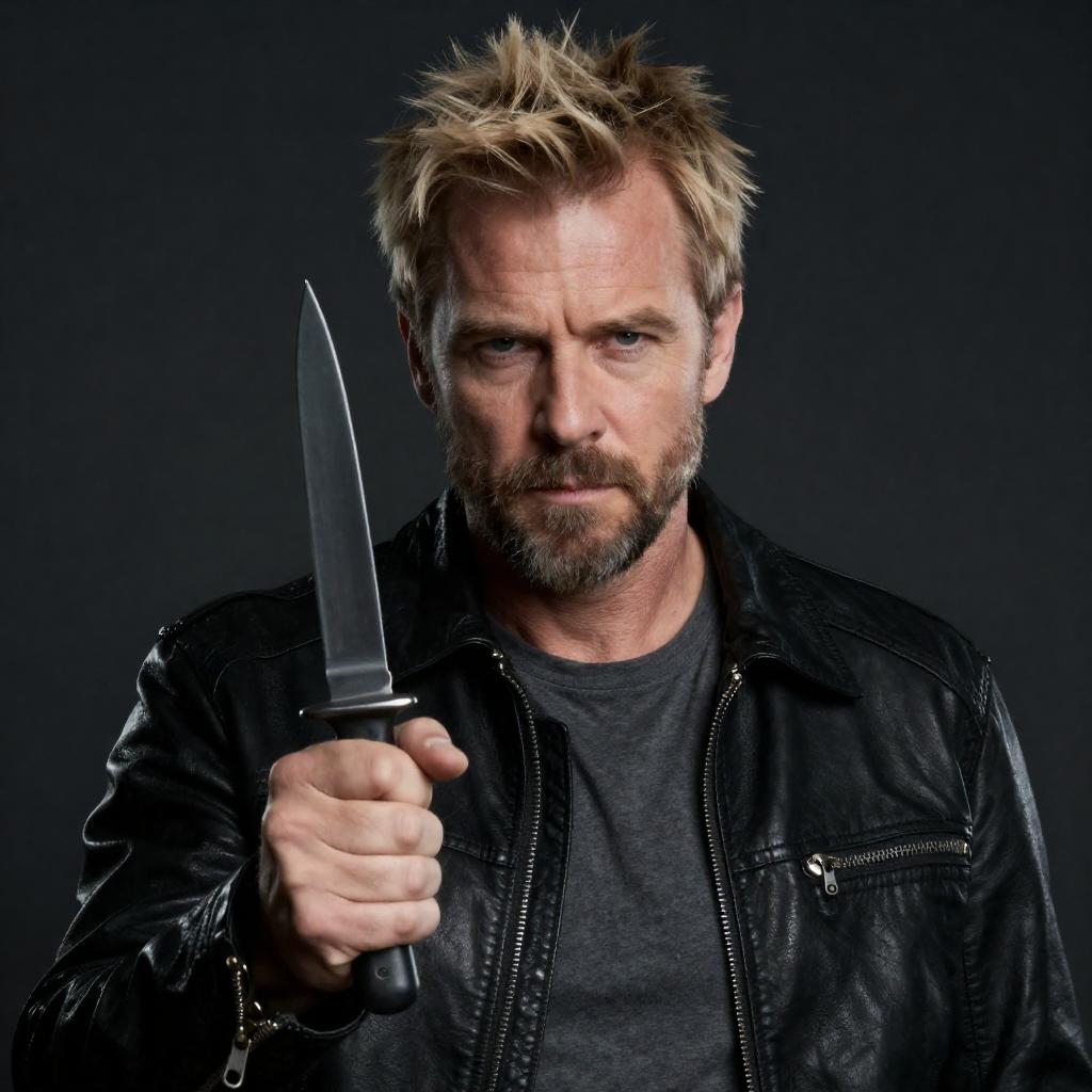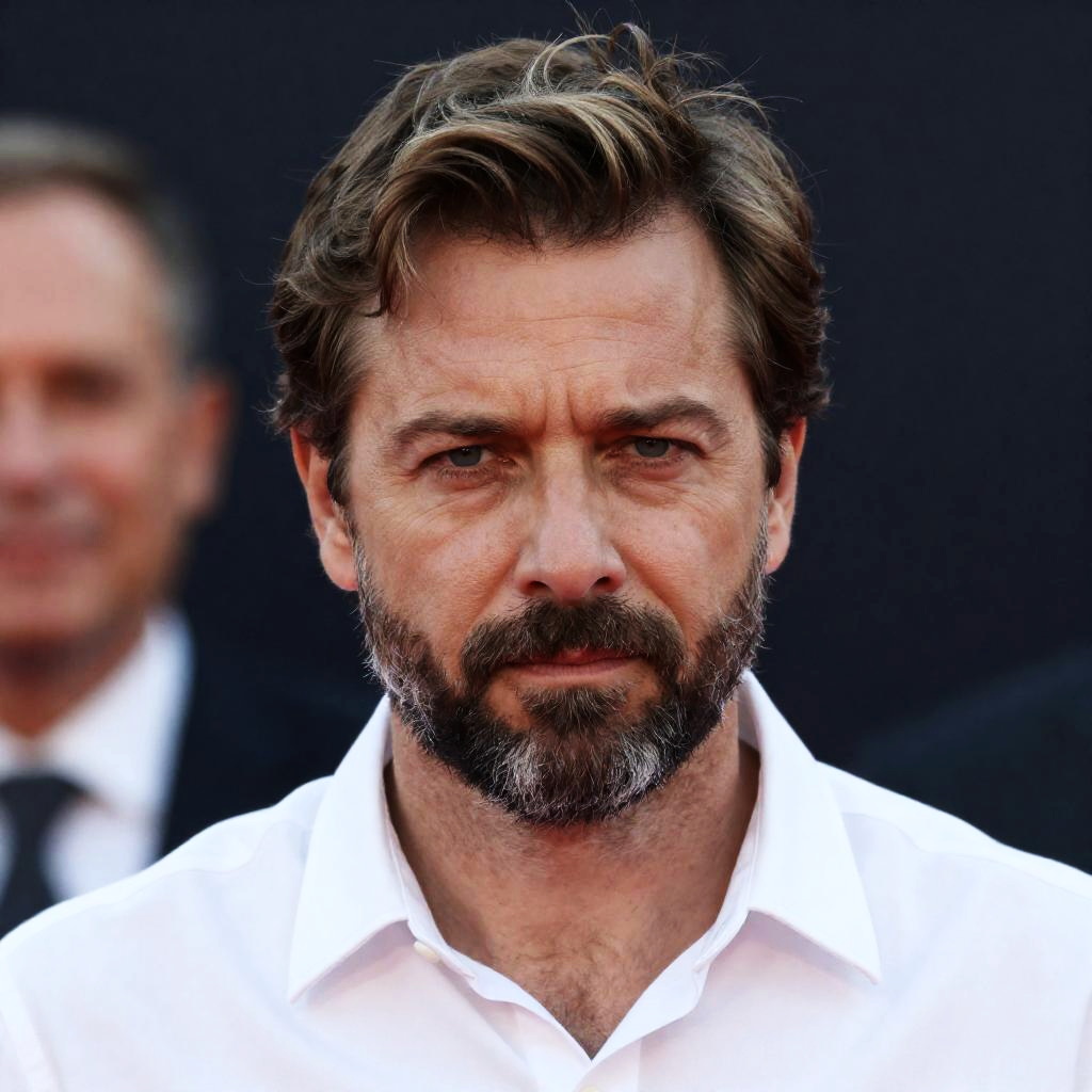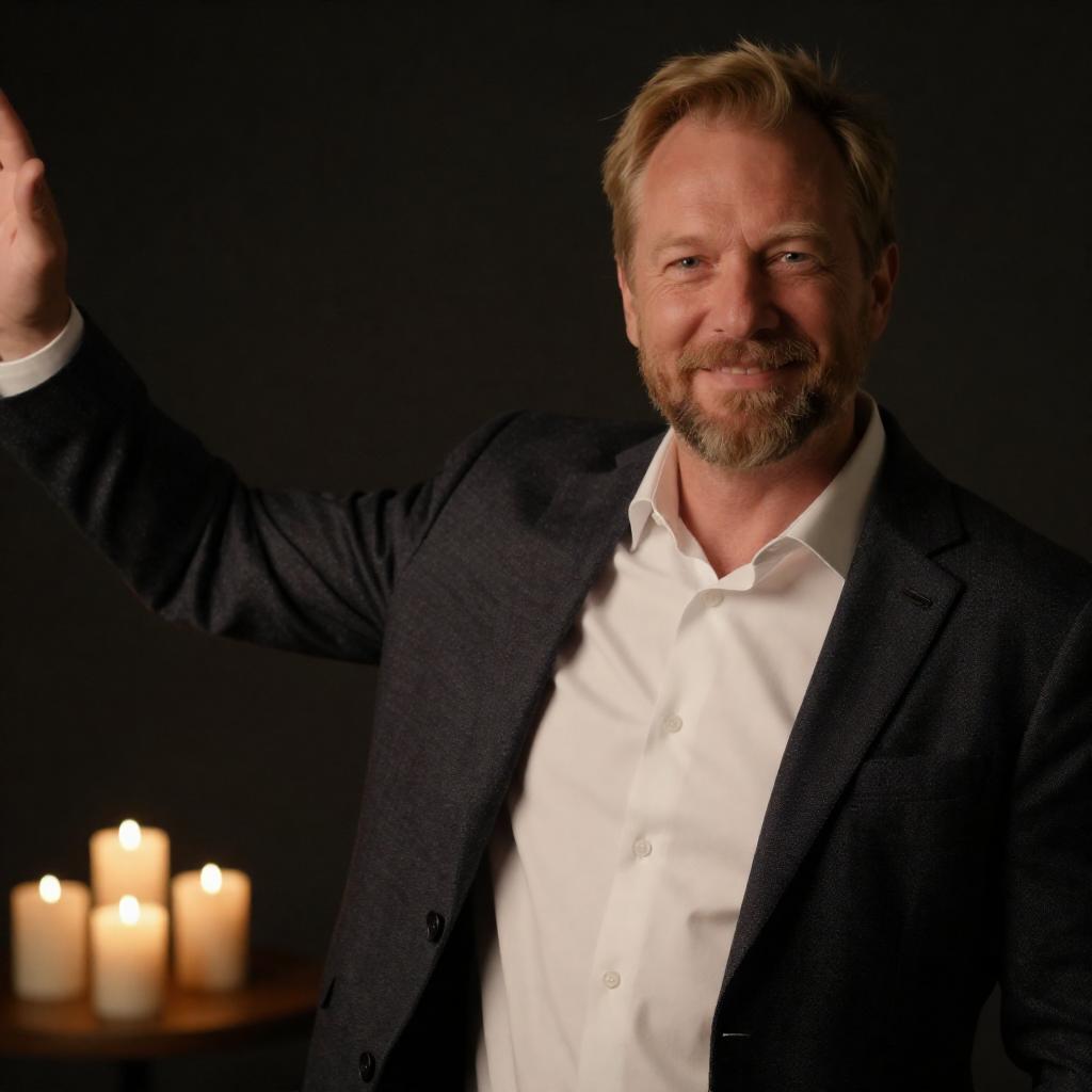 Photograph of a middle-aged man with light blonde hair and a beard, wearing a black jacket over a white shirt, against a black background. He has a slightly furrowed brow and is raising his right hand. His facial expression is intense and focused.