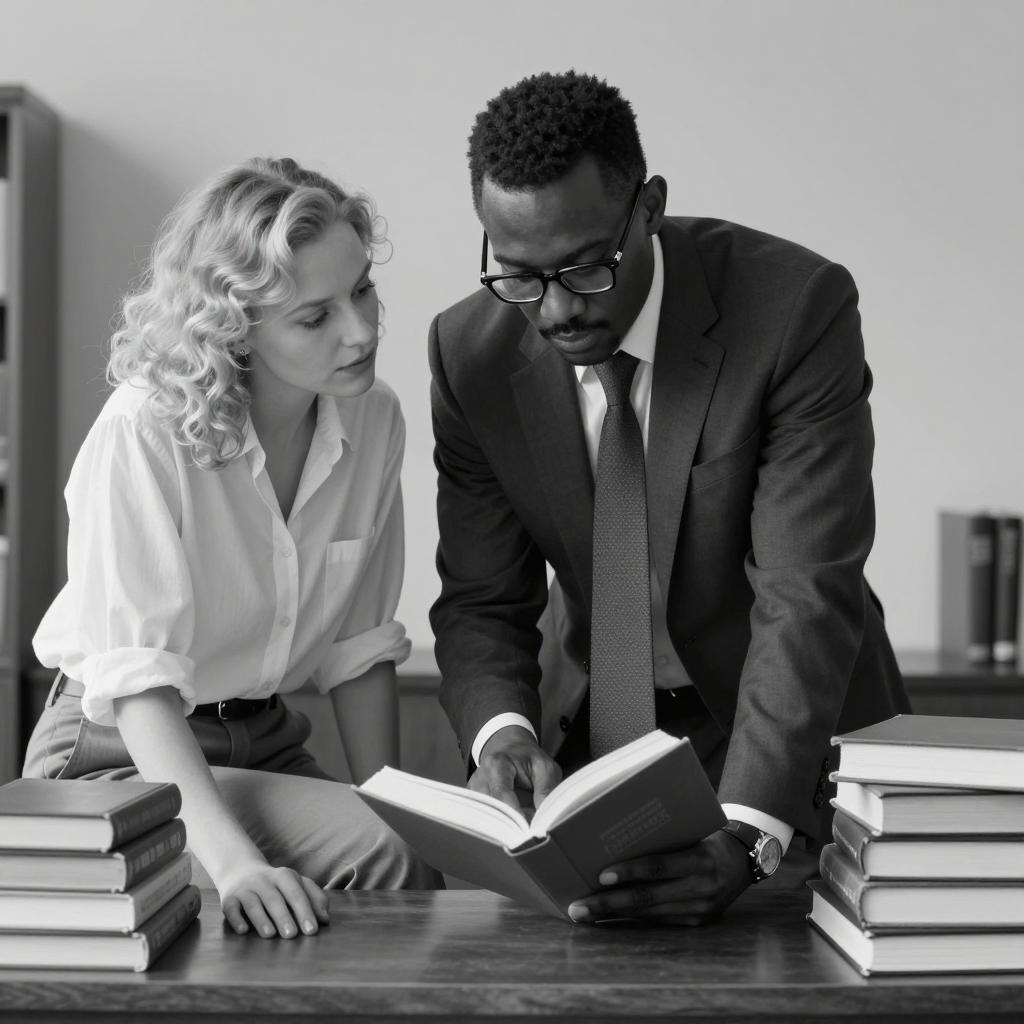 Black-and-white photograph of a man and woman in an office. Man in a suit and tie, holding a pen, sits on the floor. Woman in a striped blouse and tied top, leans forward, focused on her hand. Office background with filing cabinets, desk, and stuffed animal. Man has short, slicked-back hair, intense expression. Woman has short, wavy hair, neutral expression. Both interact closely. Man sits behind woman, slightly to her right. Desk cluttered with papers and objects on the right.