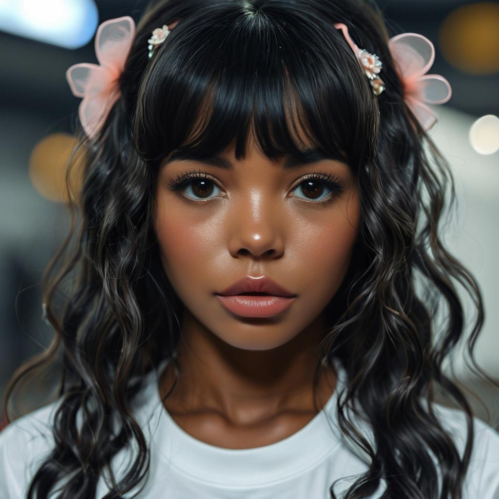 Photorealistic digital portrait of a young Black woman with smooth, dark brown skin and large, expressive brown eyes. She has long, wavy black hair adorned with pink and white hair accessories, including small bows and flowers. Her full lips are slightly parted, and she wears a white shirt. The background is blurred with bokeh lights in shades of yellow and white, creating a soft, glowing effect. The lighting highlights her glossy skin, giving a polished, almost ethereal appearance. The overall style is hyper-realistic with a focus on detailed facial features and textures.