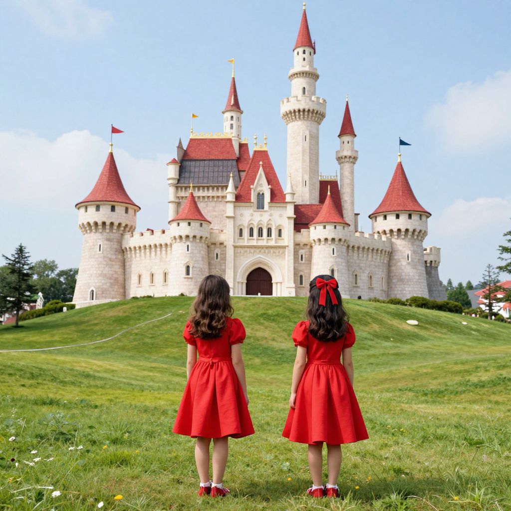 Two children in vibrant red dresses stand before a whimsical, fairytale castle perched atop a lush, rolling landscape, its red-roofed towers and flag-dotted spires defying the mundane, as if conjured from the dreams of childhood.