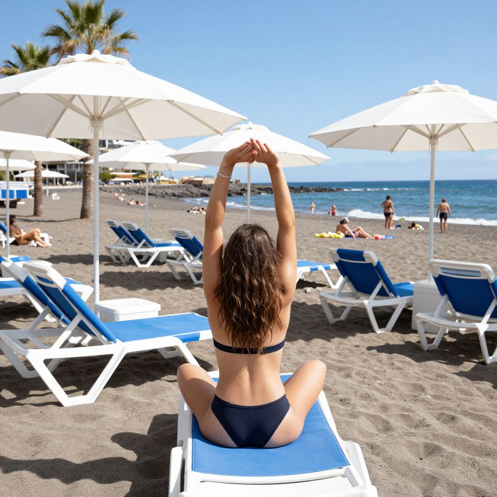 Woman stretching arms above head on a sunny beach in Tenerife, surrounded by blue sun loungers, white umbrellas, and palm trees, with people enjoying the sand and sea in the background.