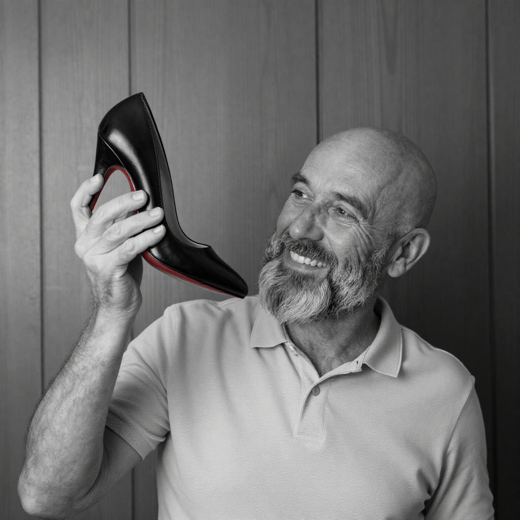 Middle-aged bald man with gray beard wearing a light-colored polo shirt, holding a black high-heeled shoe with a red sole. The man is smiling and looking at the shoe against a wooden paneled background. The image is primarily monochrome with selective color highlighting the shoe's red sole.