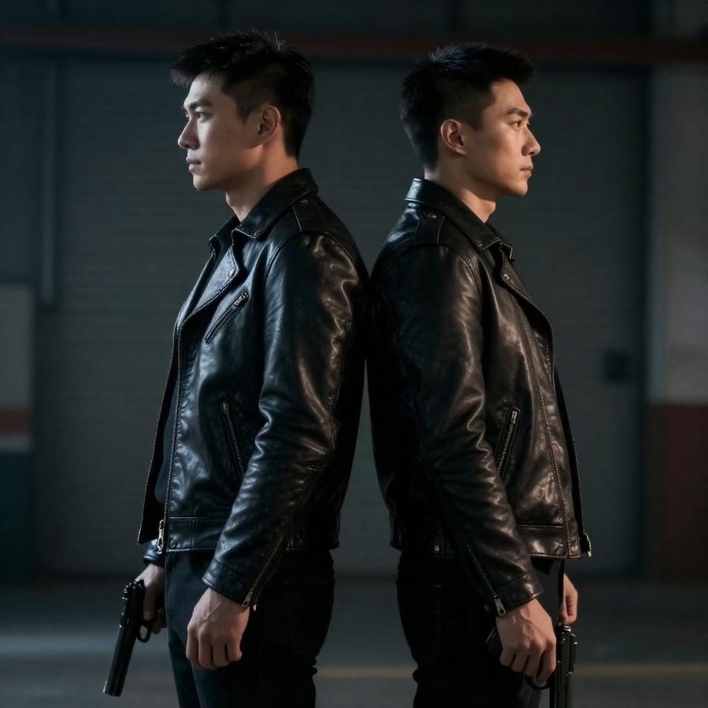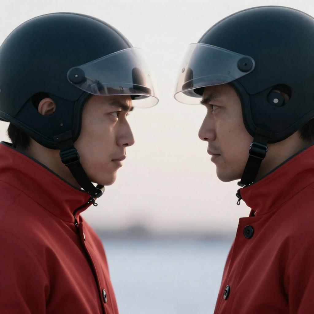 Helmeted Face-Off Close-Up: Red-Coated Confrontation