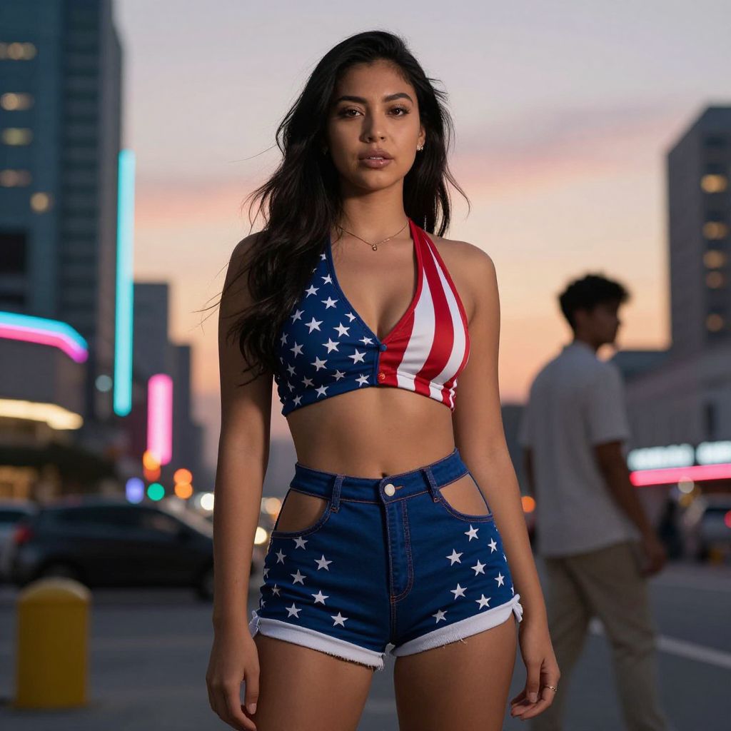Photograph of a young woman with long, wavy black hair and tan skin, standing in a city street at dusk. She wears a blue halter top with white stars and red stripes, and high-waisted denim shorts with white star patterns. Her midriff is exposed, showcasing a slim, toned physique. The background features blurred city lights, neon signs, and tall buildings, with a man in a white shirt walking by. The sky has a gradient of pink and blue hues. The overall style is modern and urban, with a focus on patriotic fashion.