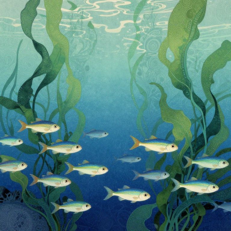 Visualize an idyllic coastal vista reminiscent of Monet's famed Water Lilies series, where rhythmic waves tenderly lap against the sand. From a bird's eye view, behold several sirens reclining lazily on the shoreline, their luminescent fins shimmering under the warm glow of the sun. This peaceful tableau captures their celestial grace, invoking feelings of reverence and serenity as they exchange lighthearted jests with one another, reflecting Monet's signature use of color and brushstrokes to craft an emotional spectrum that calms the spirit while igniting a spark of curiosity and fantasy.