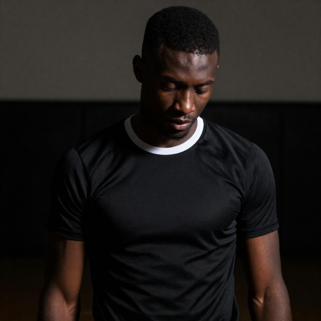 Photograph of a dynamic boxing scene in a dimly lit gym. A muscular Black man in a gray shirt and pants leaps mid-air, delivering a powerful kick to a smaller, bald Black man in black attire. Another Black man crouches in the background, watching intently. Blue and yellow punching bags are visible on the left, with vertical wooden slats on the right.