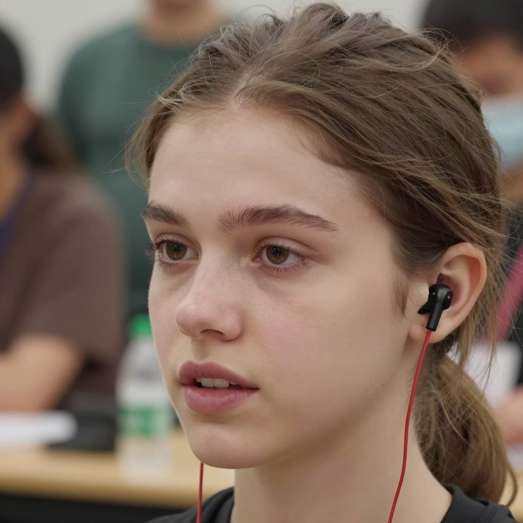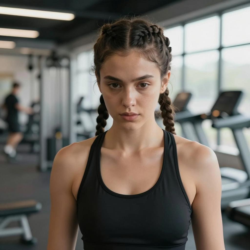 Young woman with fair skin, brown hair in loose waves, holding striped towel over shoulder, looking serious. Short boy with dark hair, olive skin, yellow towel around neck, looking slightly to the side. Kitchen background with shelves, pots, and hanging items. Woman on left, boy on right, standing close together.