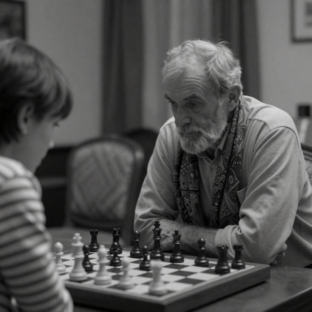 Black-and-white photo of an elderly man with a beard wearing a patterned scarf and light-colored shirt, intensely focused on a chess game with a young woman with short hair wearing a striped shirt. They are seated at a wooden table in a dimly lit room featuring a patterned chair and curtains in the blurred background.
