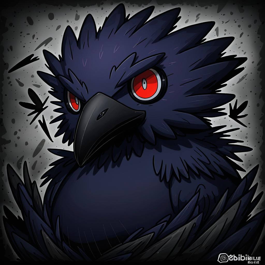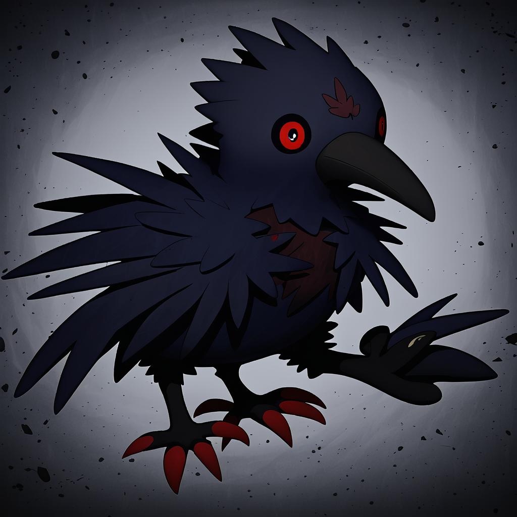 Digital drawing of a dark, ominous crow with a black, feathered body and sharp, red-tipped claws. Its vivid red eyes stand out against the dark feathers, and a small, red scar is visible on its forehead. The crow's beak is large and pointed, and its feathers are drawn in jagged, spiky lines. The background is a gradient of light blue to dark gray with scattered black specks, creating a shadowy, eerie atmosphere. The crow is depicted in a dynamic, mid-flight pose, with one wing slightly raised and one claw extended forward. The style is bold and graphic.