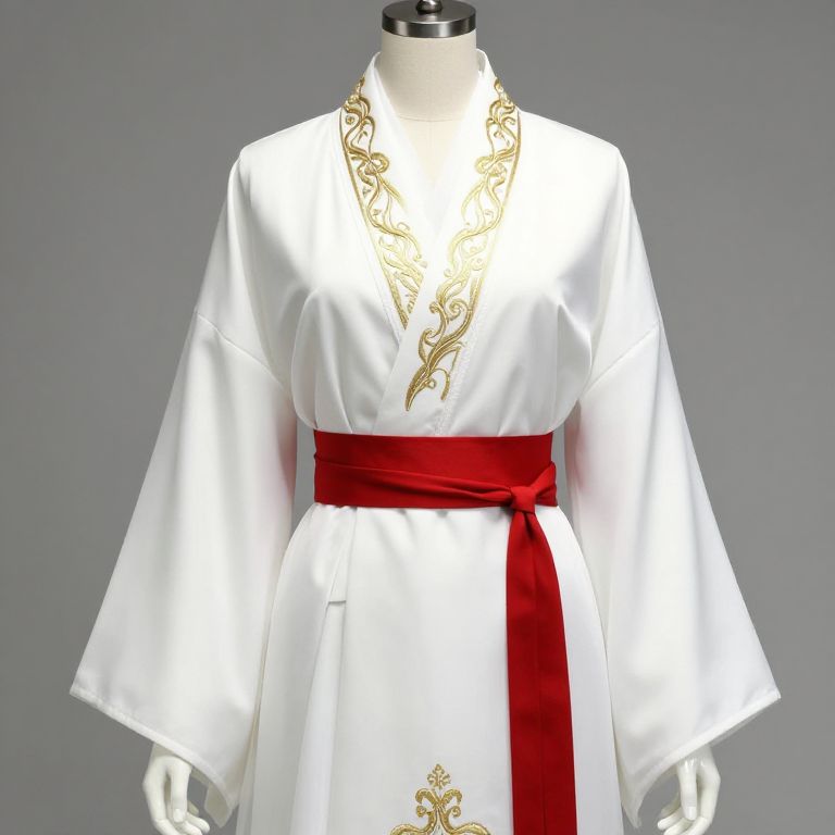Mannequin wearing a white robe with gold embroidery and a red belt.