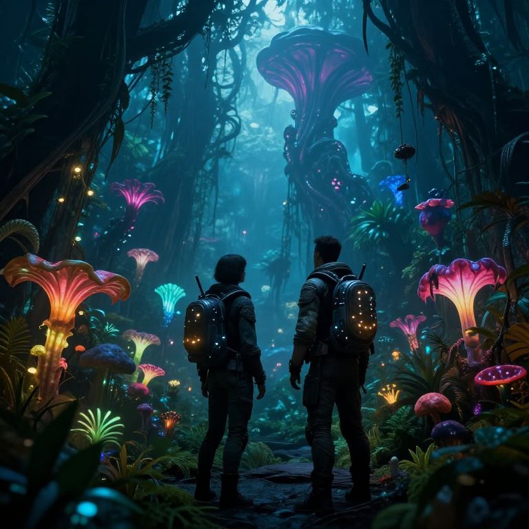 Metwo exploring an alien jungle with bioluminescent plants and strange creatures, vibrant colors and surreal atmosphere, advanced gear glowing softly in the dark, mist floating through giant futuristic foliage, a blend of technology and nature in harmony.