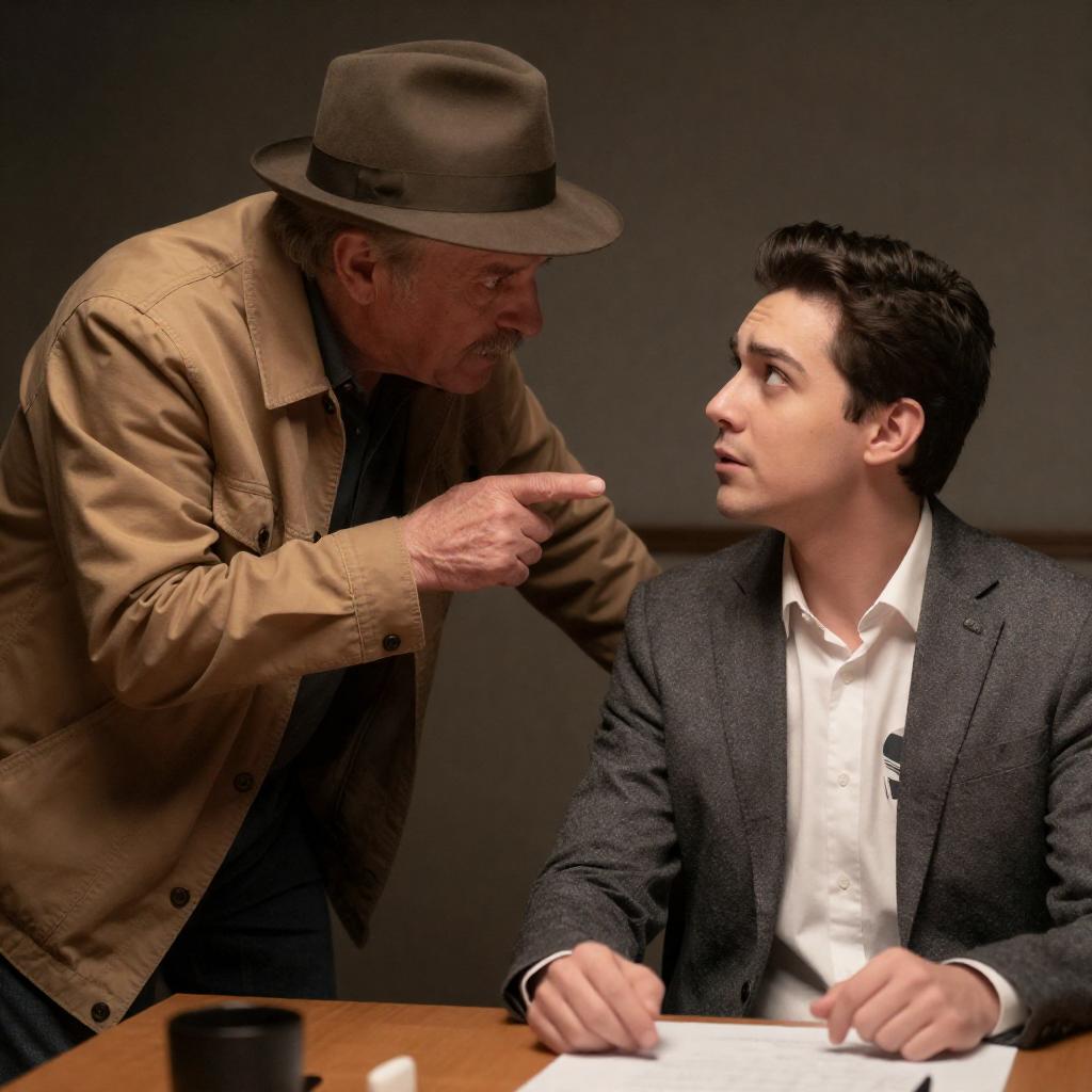 Photograph of two men, close-up. Older man with graying hair, slightly wrinkled face, green shirt, looks down. Younger man with short brown hair, gray sweater, looks at paper. Dimly lit background. Both focused on paper.