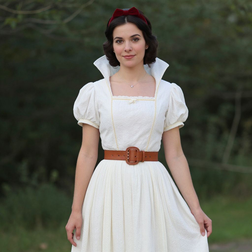 "Vintage Snow White, woman in a white dress and a brown belt"