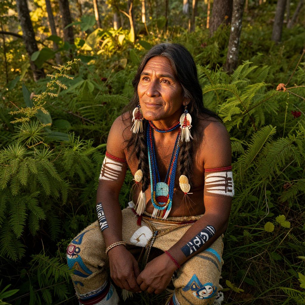 A contemplative Native American shaman with deep, wise eyes and weathered skin adorned in intricate tribal patterns sits amidst lush greenery bathed in warm golden hour light filtering through a dense forest canopy. Captured from an unusual high-angle perspective, this photorealistic portrait emphasizes the rich textures of their attire and intricate details of their headdress, conveying ancient wisdom and spiritual connection to nature as they gaze into the distance with a knowing smile.