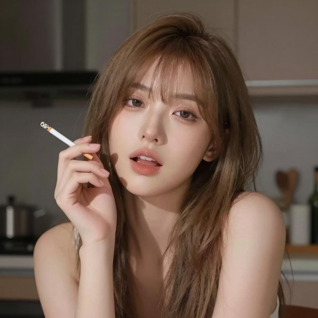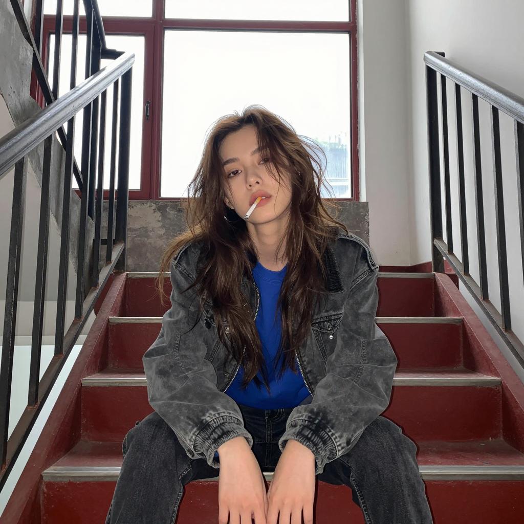Young woman with long, messy brown hair and a cigarette in her mouth sits on red stairs. She wears a gray jacket over a blue shirt. Metal railings frame the stairs on both sides. Background includes large, red-framed windows with frosted glass. She sits with hands between her legs, head slightly tilted.