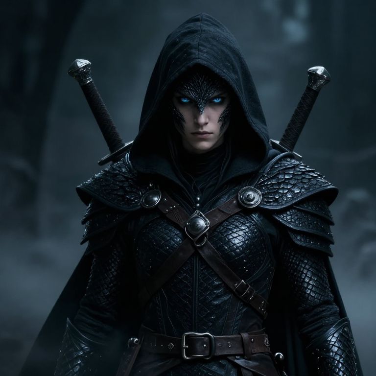 Dragonborn portrait depicting a young dragonborn assassin with sleek dark scales, hooded cloak, piercing icy blue eyes, dual daggers strapped to leather armor, shadows and fog envelop the scene, emphasizing mystery and stealth, cinematic fantasy art.