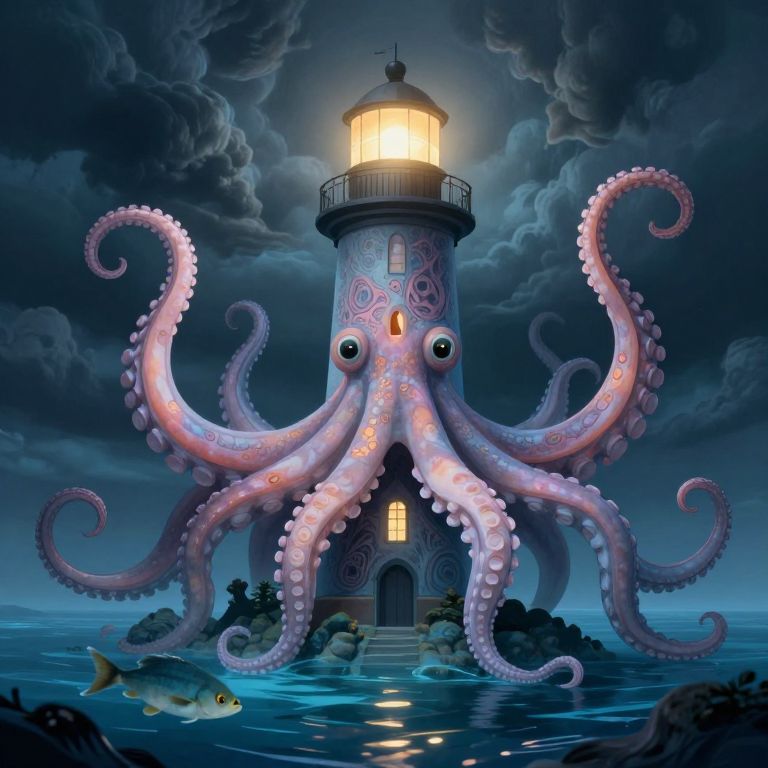 The image presents a surreal and fantastical scene dominated by a lighthouse that appears to be a cephalopod, with its tentacles swirling around it. The lighthouse, with its intricate, fractal-like patterns, stands tall against a backdrop of dark, ominous clouds. The tentacles, rendered in a soft, pastel palette, seem to be alive, with glowing eyes and a mouth, adding a sense of movement and life to the scene. The lighthouse itself is adorned with multiple windows, each emitting a warm, golden light that contrasts with the cool, deep blues of the surrounding water. In the foreground, two small fish swim, one near the bottom left and the other closer to the center, both appearing to be part of the surreal landscape. The overall composition is dynamic, with the lighthouse and its tentacles creating a sense of depth and perspective, while the dark clouds and the glowing fish add a layer of mystery and intrigue to the scene. The interplay of colors, textures, and shapes creates a visually rich and complex image that invites the viewer to explore its many details.