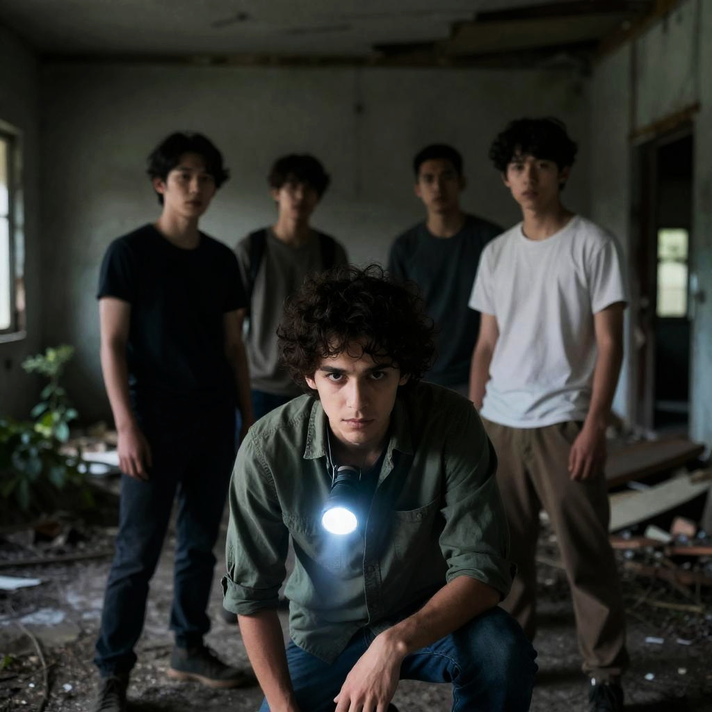 Young man in gray shirt and maroon cap, crouching behind a blood-stained wall, looking scared. Blue-lit, grimy room with bodies on floor. Blood splatters on wall and floor. Red light in background. Dark, intense atmosphere.