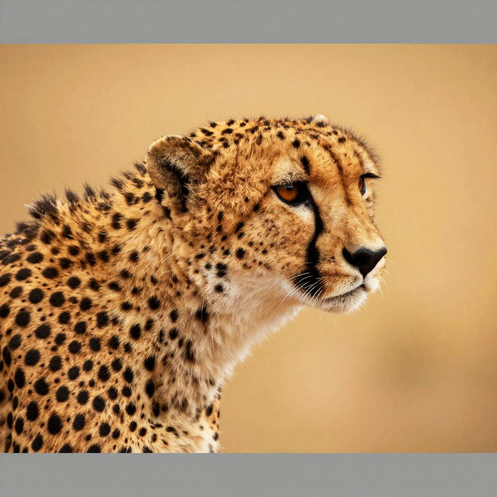 Photograph of a cheetah in profile, facing right. The cheetah's golden-yellow fur is adorned with numerous black spots. Its piercing amber eyes are focused intently forward, and its black-tipped ears are slightly back. The cheetah's black tear-like markings run from the inner corners of its eyes down to its mouth. The background is a soft, blurred gradient of warm beige and light brown, highlighting the cheetah's detailed fur texture. The image is bordered by a narrow gray frame on the top and bottom. The overall composition emphasizes the cheetah's alert and graceful demeanor.
