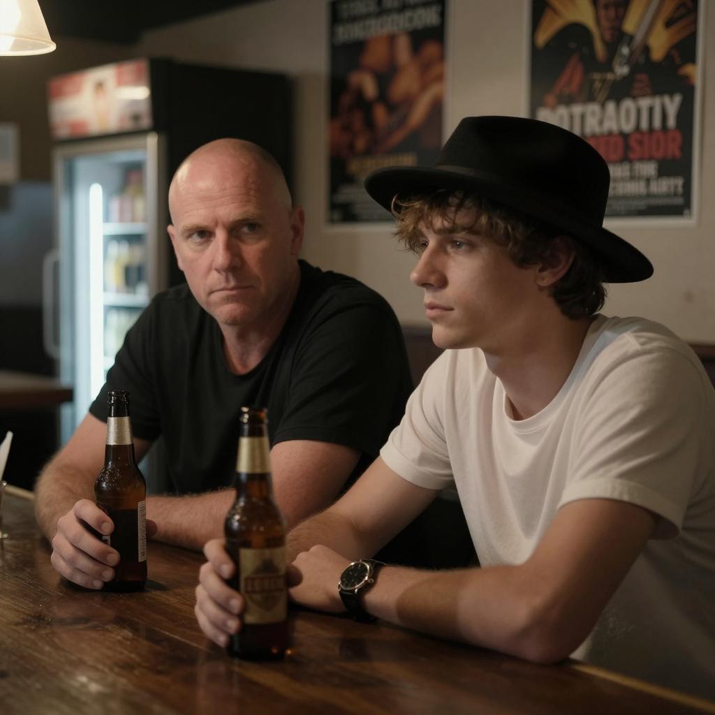 Two men sitting at a dimly lit bar. Bald man in black shirt leaning forward, holding a beer bottle. Younger man with black hat and white shirt looking ahead. Background with posters and fridge. Low light, shadows.