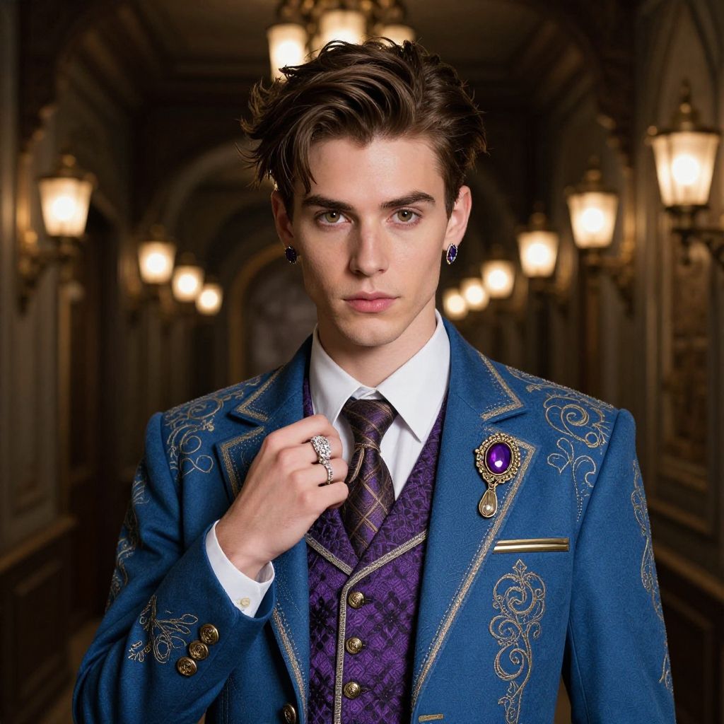 Portrait of a slim young man with striking hazel eyes and distinct features, dressed in a custom-tailored blue steampunk-inspired suit with intricate embroidery and a patterned purple waistcoat. He wears a decorative brooch, diamond ring, and gemstone earrings, styled with neatly groomed hair that flows naturally. The background features a dimly lit, ornate corridor with vintage lamps, enhancing the steampunk wonderland aesthetic.