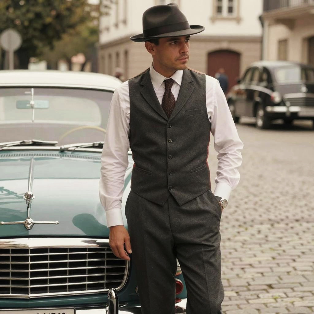 Stylish and neatly dressed gentleman in a vintage-inspired outfit, including a waistcoat and fedora hat, standing by classic car on cobblestone street, cinematic lighting and atmosphere