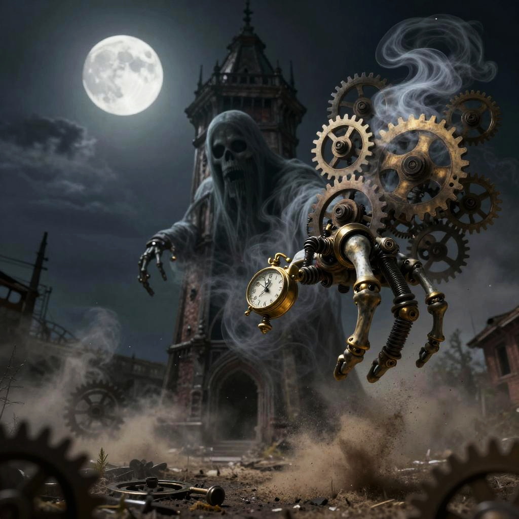 A spectral wraith with clockwork skeletal fingers with brass joints and exposed springs reaching forward, its form dissolving into trailing gears and cogs dissolving into curling steam and metallic motes, moving through a abandoned moonlit clocktower filled with drifting dust and distant ticking.